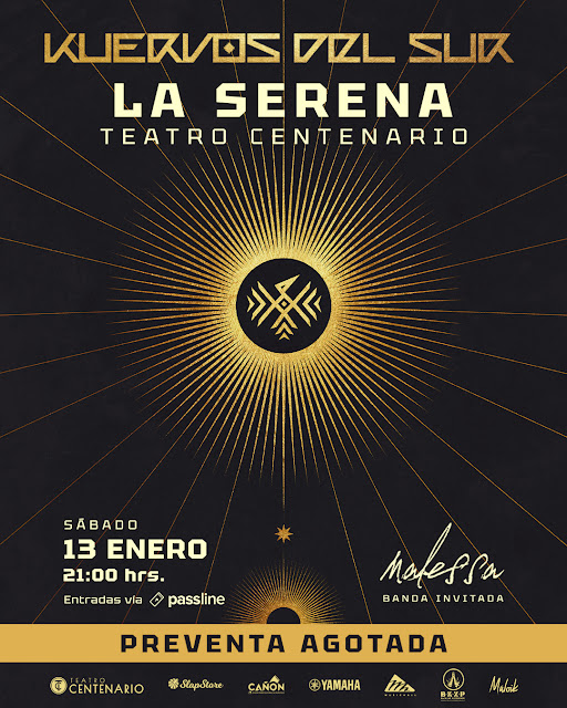 La banda de rock de raíz Kuervos del Sur se presenta el próximo sábado 13 de enero desde las 21 hrs. en el Teatro Centenario, ubicado en plena Plaza de Armas en Gregorio Cordovez 391, La Serena; lugar donde presentará su cuarto disco de estudio “De La Luz”, producido por Alain Johannes (músico chileno-estadounidense que ha trabajado con artistas de la talla de Chris Cornell, Queen of the Stone Age y Arctic Monkeys por nombrar algunos)..
